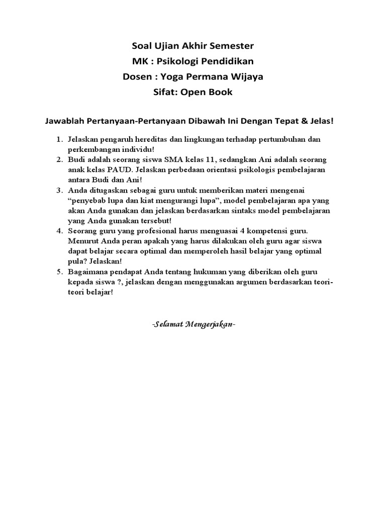 Contoh soal psikologi pendidikan nomor 4.